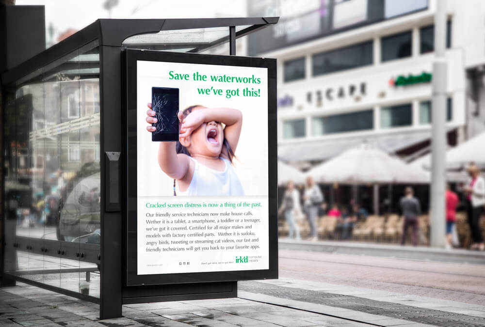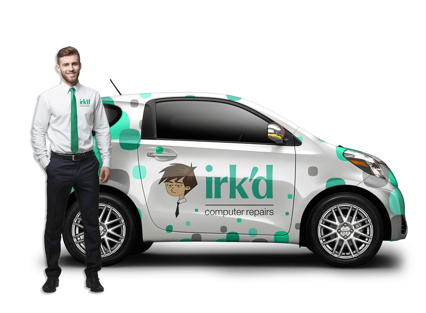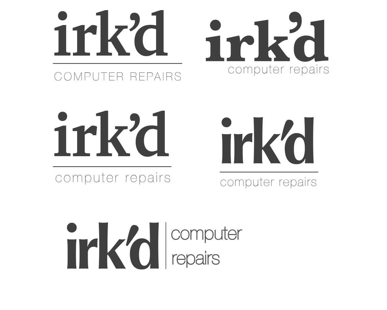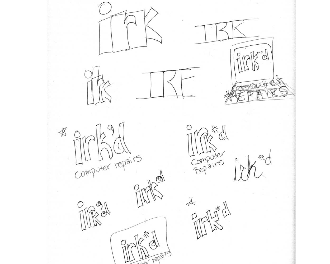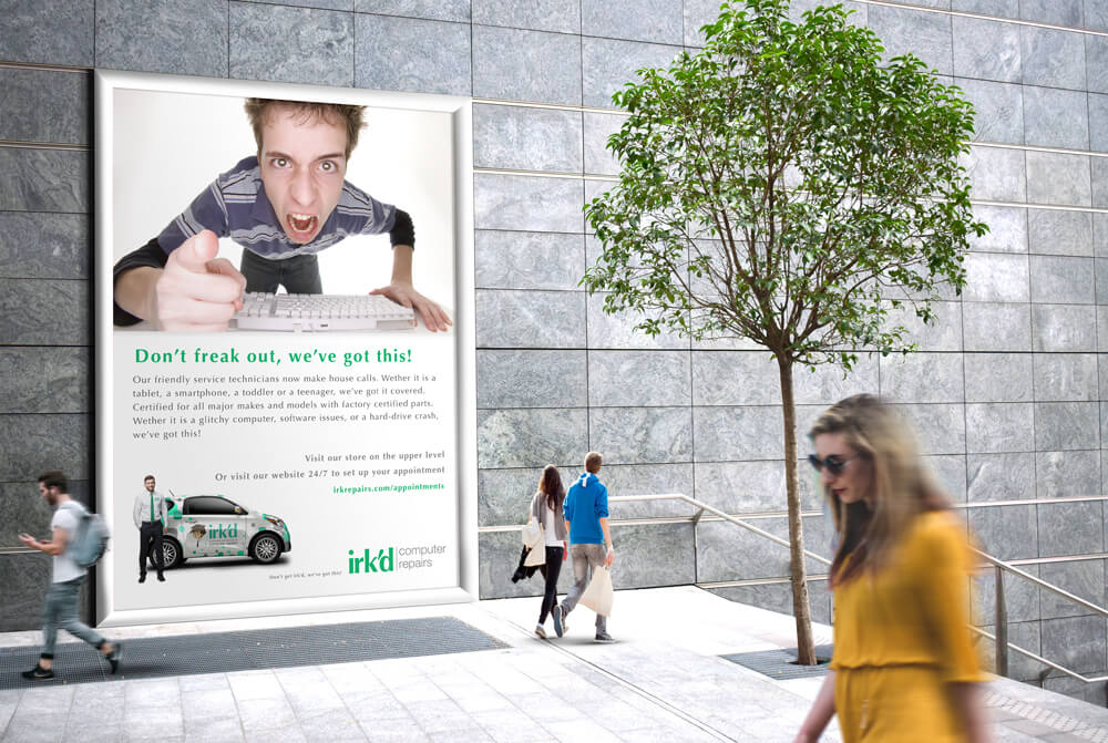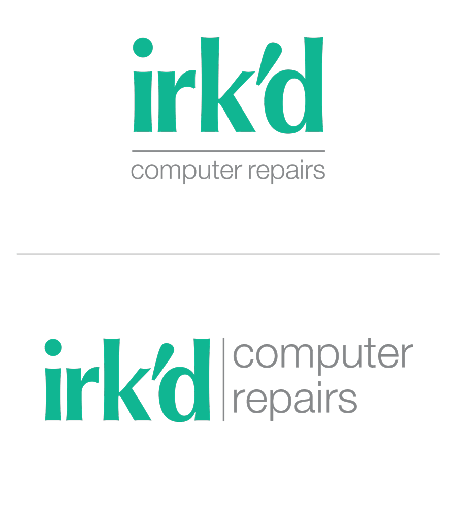 The name Irk'd Computer Repairs was born of my many years working as a retail manager. It was a tongue-in-cheek salute to all of those trying customer interactions. I wanted to create a brand identity that was both professional and yet had a sense of humor. In addition to the company wordmark logo, I also created a company maskot. His black tie and white dress shirt say professional, but his expression speaks for itself.